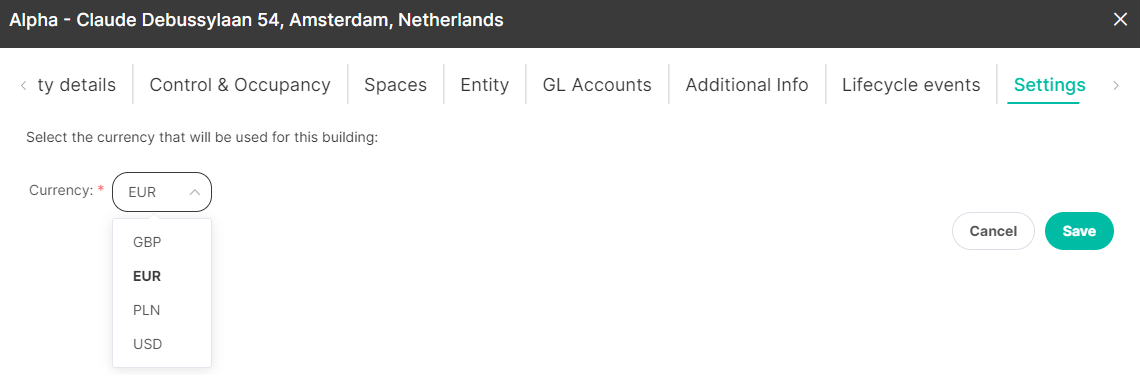 Property details: contains the property details of an asset. Here, you can edit the basic information of an asset, such as name, property code, construction year and address.