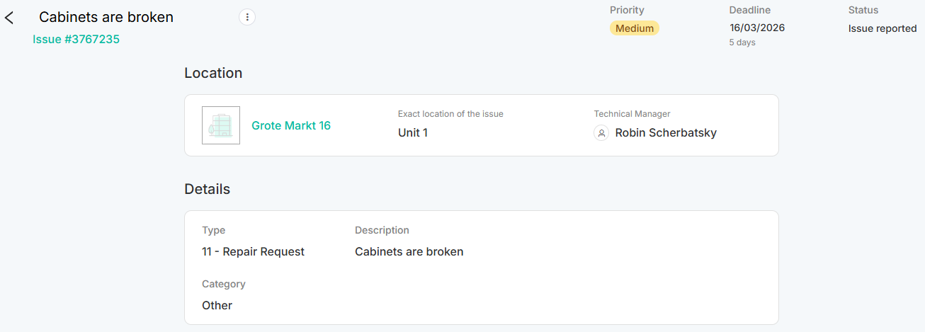 Below the header, you can see Location and Details. Location shows which asset the issue is referring to, its exact location, and the Technical Manager. The Details section shows the type, description, category, and attachments added to the issue.