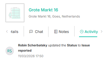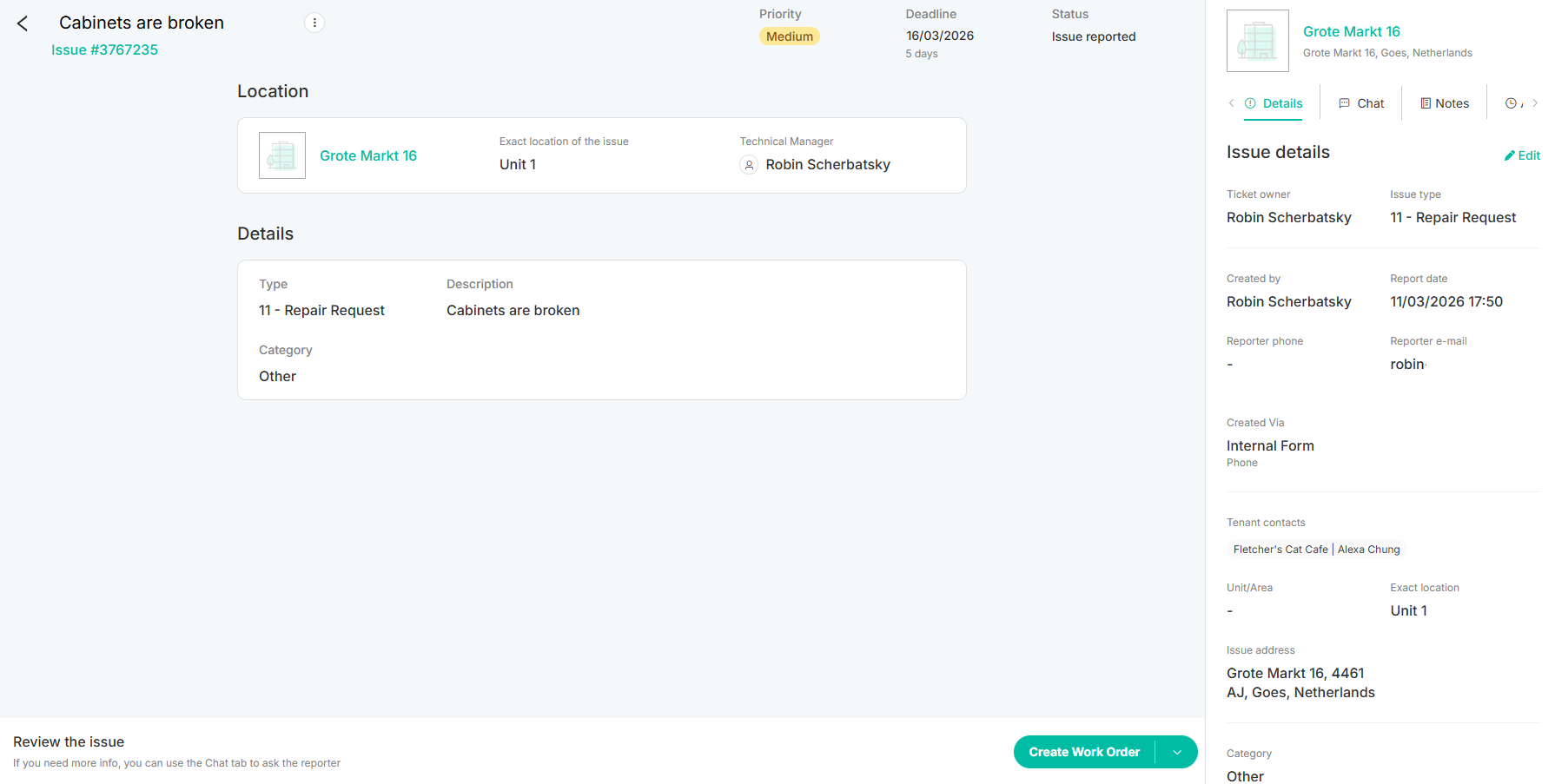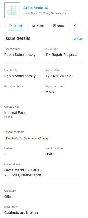 Tab 1: Details contains information about the ticket, such as owner, tenant, reporter and their contact info, category, exact location, description, and attachments; this is also where you can make changes to the contents.