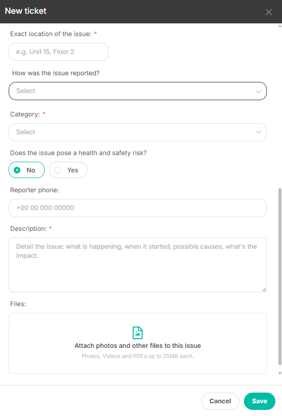 Exact location of the issue: e.g. Unit 15, Floor 2.