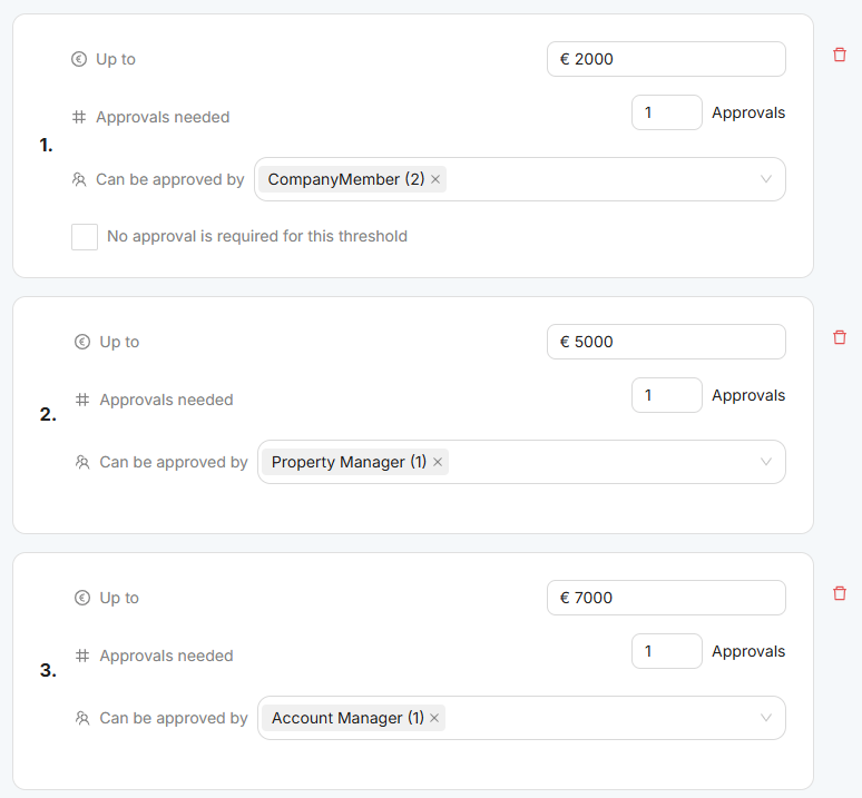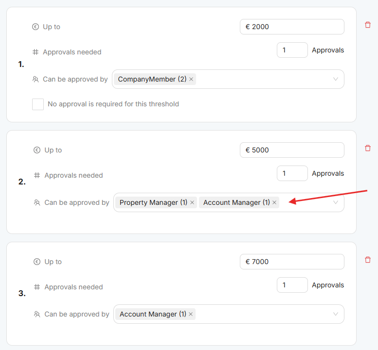 Let's say your role is CompanyMember and you can approve up to €2000, but the project you are working on comes to €6800. That means that it will need to be approved by someone with the CompanyMember role, followed by the Property Manager, and then it will be sent for the Account Manager's approval - the one with the mandate high enough to grant final approval.