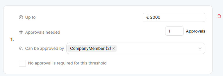 In the example below, the rule is that users assigned as CompanyMembers can, by themselves, approve up to €2000.