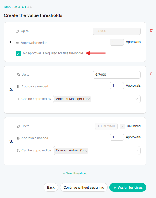 The thresholds work considering that every user in Proprli has a role. By setting up the threshold, you can say to what amount this role is allowed to spend or to instruct to a supplier without needing further approval.