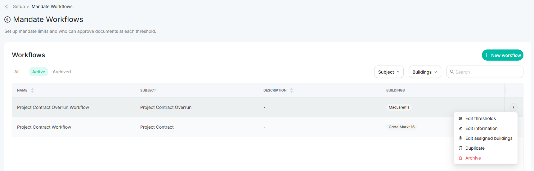Within the Mandate workflows page, you can adjust the thresholds, workflow information, edit assigned buildings, duplicate, or archive the workflow.