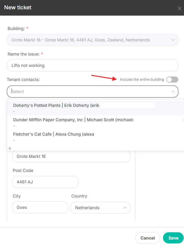 The flow of creating a new ticket remains similar. After selecting the building and naming the report, you can select the tenants from the dropdown menu or include the entire building.