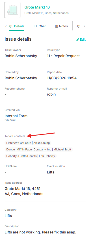 All tenants linked to the ticket will be listed on the Details tab.