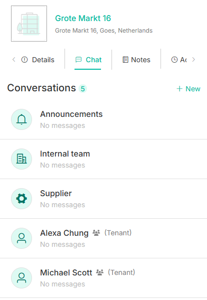 On the top right-hand side of the chat section, you can click on "+New" and select individual tenants to communicate with directly.