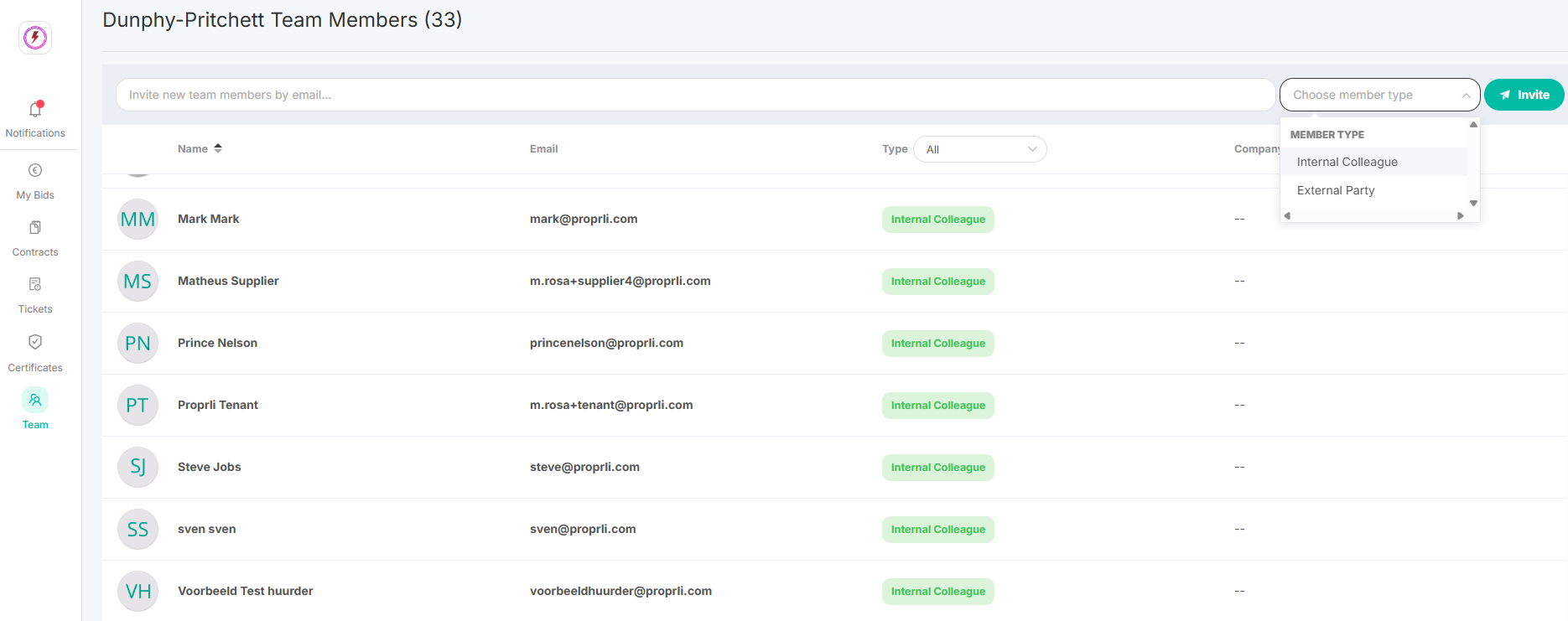 The section Team allows you to see an overview of your colleagues as well as any external parties you might have invited to Proprli. You can also invite new users by entering their email address, selecting member type, and clicking on Invite.